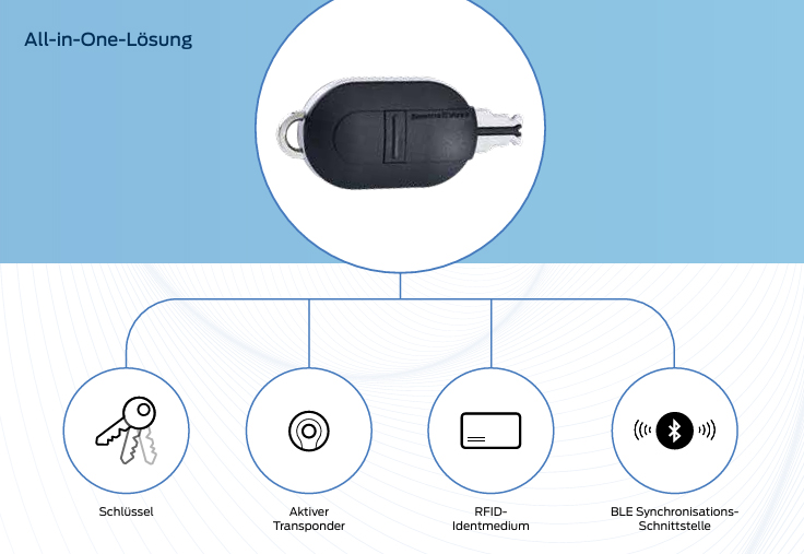 - All-in-One-Lösung: Key, Aktiv-Transponder, BLE Kommunikations-Schnittstelle und optionales RFID-Identmedium in einem